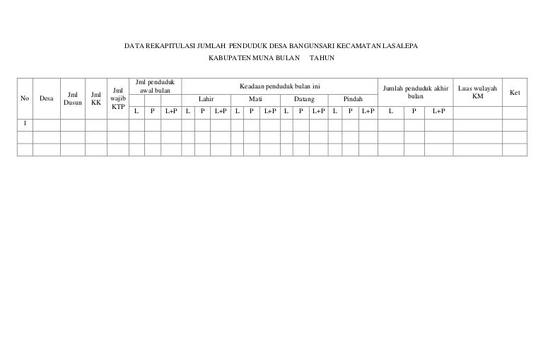 _____ rukun tetangga (rt) : _____ kelurahan / desa : Nama lengkap kependudukan p/l tanggal lahir tempat lahir propinsi wnri/keturunan orang asing keluarga (nik) no. Aug 31, 2020 · download aplikasi data penduduk gratis software kependudukan rt rw desa excel full kamis 01 februari 2018 1 komentar edit format administrasi desa blogspot com jika sebelumnya admin blog ini sudah mengizinkan saya me review aplikasi apbdes excel software administrasi desa full. Diisi dengan nomor secara berurutan dari nomor 1, dan seterusnya sesuai dengan jumlah dusun/lingkungan di desa yang bersangkutan